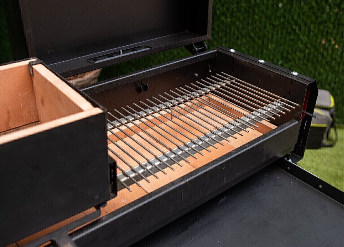 Гриль имеет рабочее пространство размером 585х350 мм, что позволяет одновременно готовить большое количество продуктов или целое блюдо. Съемная нержавеющая решетка легко моется и долговечна. Огнеупорная керамическая плита равномерно распределяет тепло по всей поверхности, обеспечивая равномерность прожарки. В отличие от металлических мангалов, тепло не расходуется впустую, нагревая окружающий воздух, а концентрируется на приготовлении пищи. Коэффициент теплопроводности керамического материала низкий, поэтому тепло сохраняется внутри, а снизу металл остается еле теплым, что важно для безопасности. Боковые конвекционные крышки также отводят тепло от гриля.