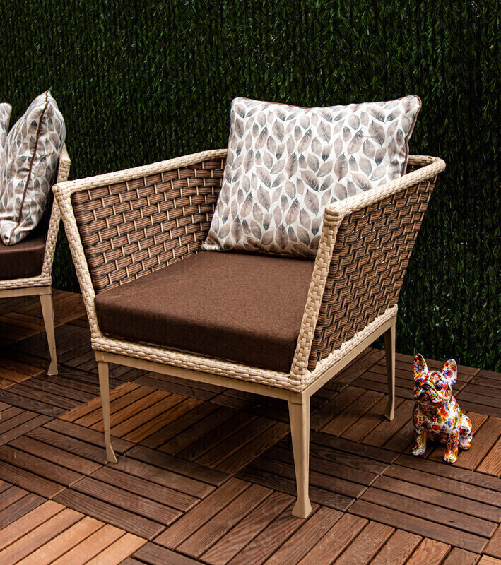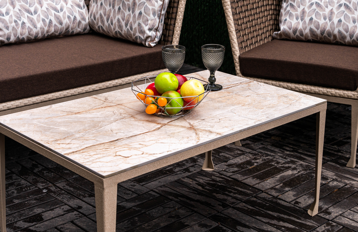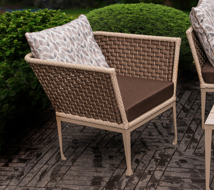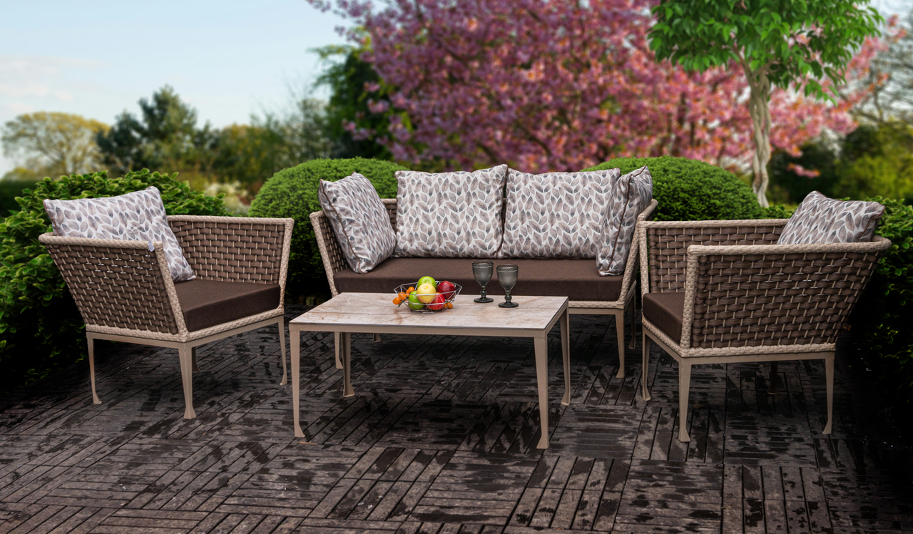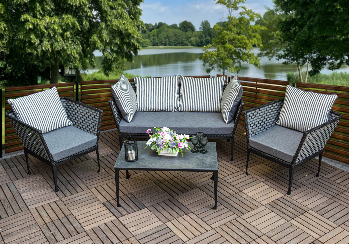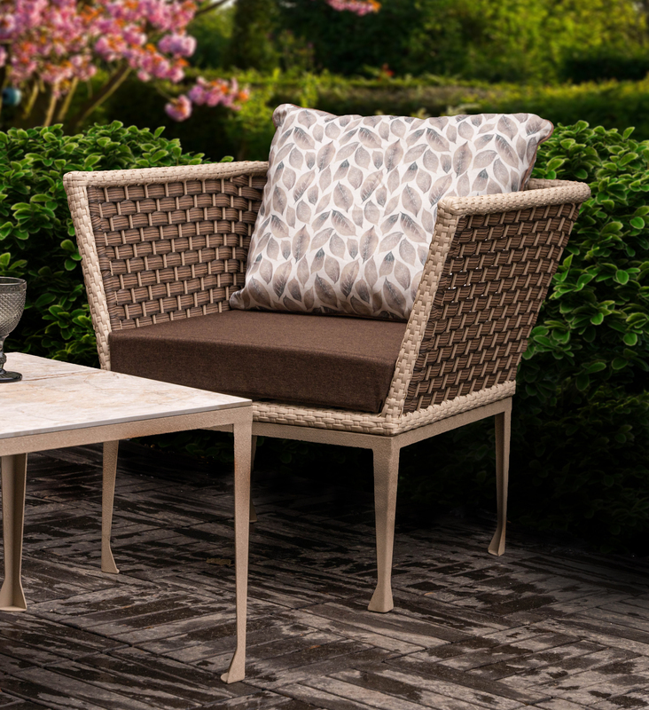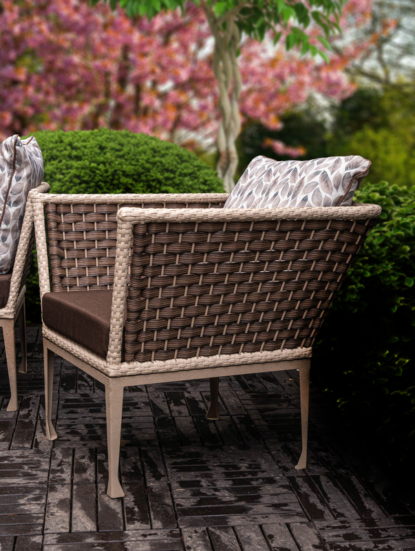 Садовая мебель «Оникс» состоит дивана, двух кресел и стола. Мебель изготовлена из металлического каркаса и дополнена мягкими, удобными подушками.