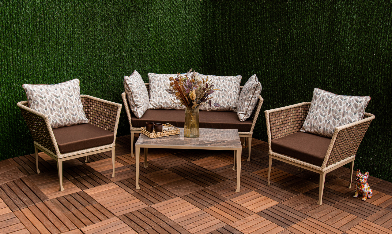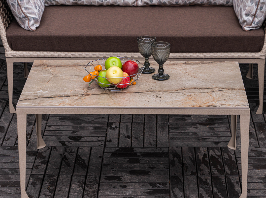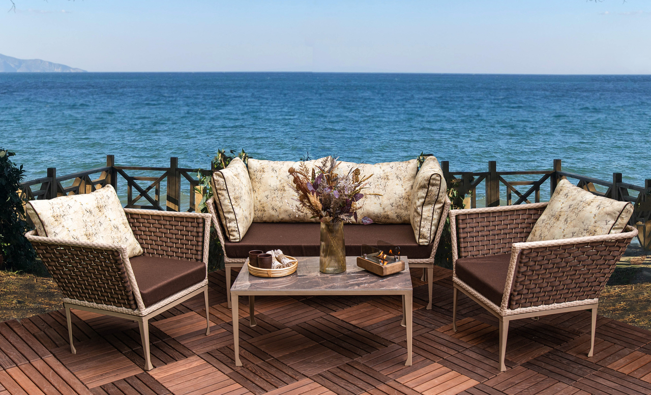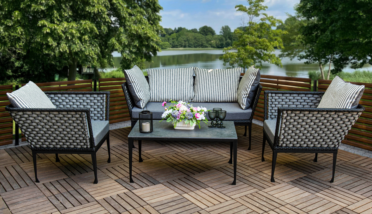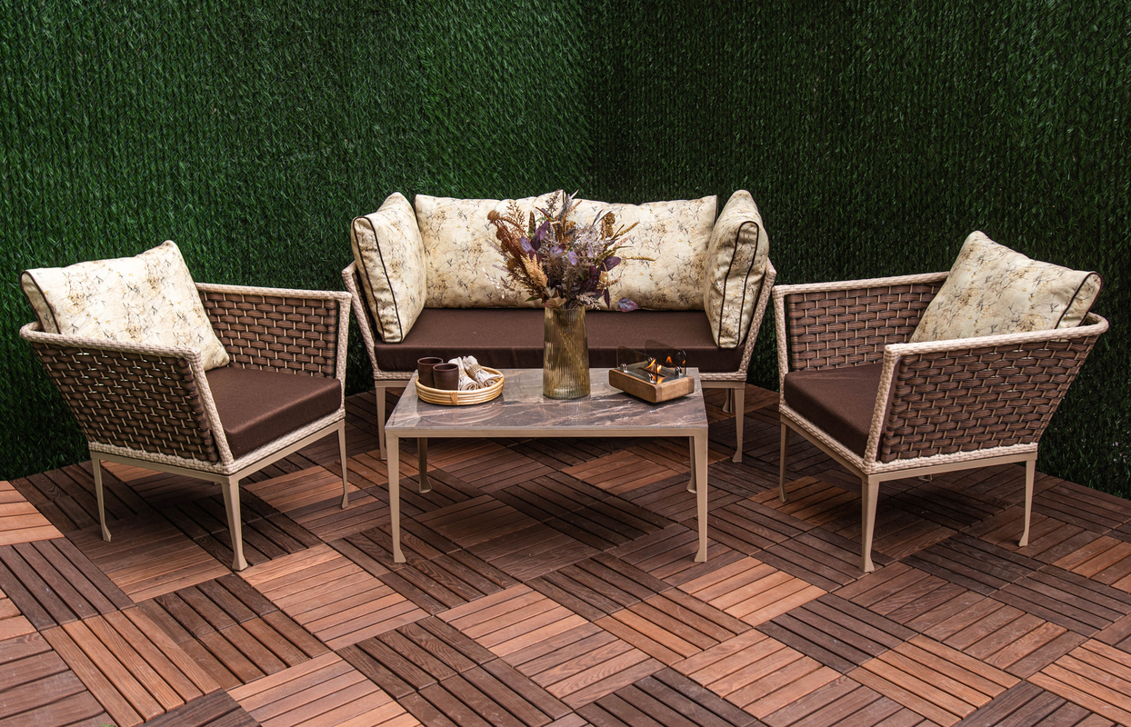 Садовая мебель «Оникс» состоит дивана, двух кресел и стола. Мебель изготовлена из металлического каркаса и дополнена мягкими, удобными подушками.