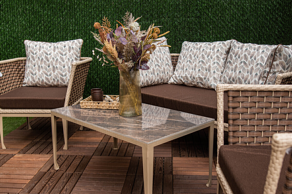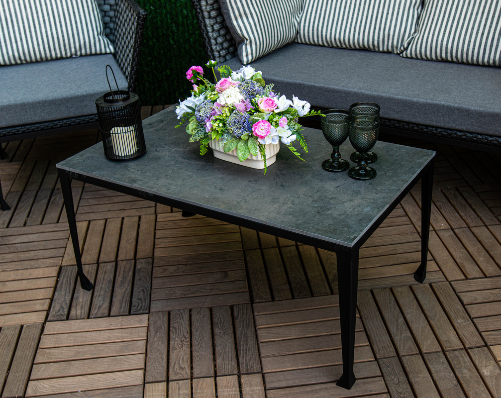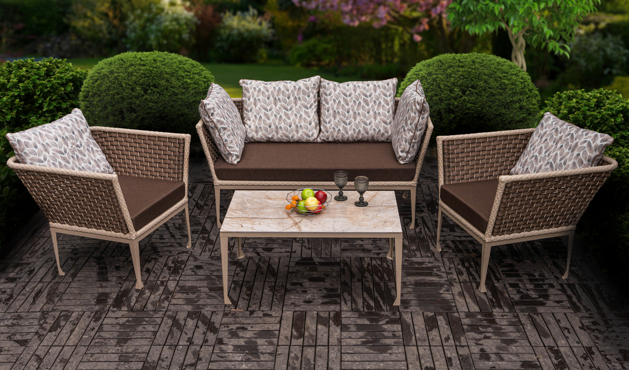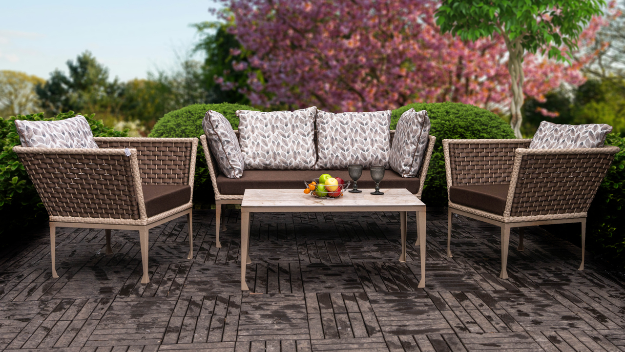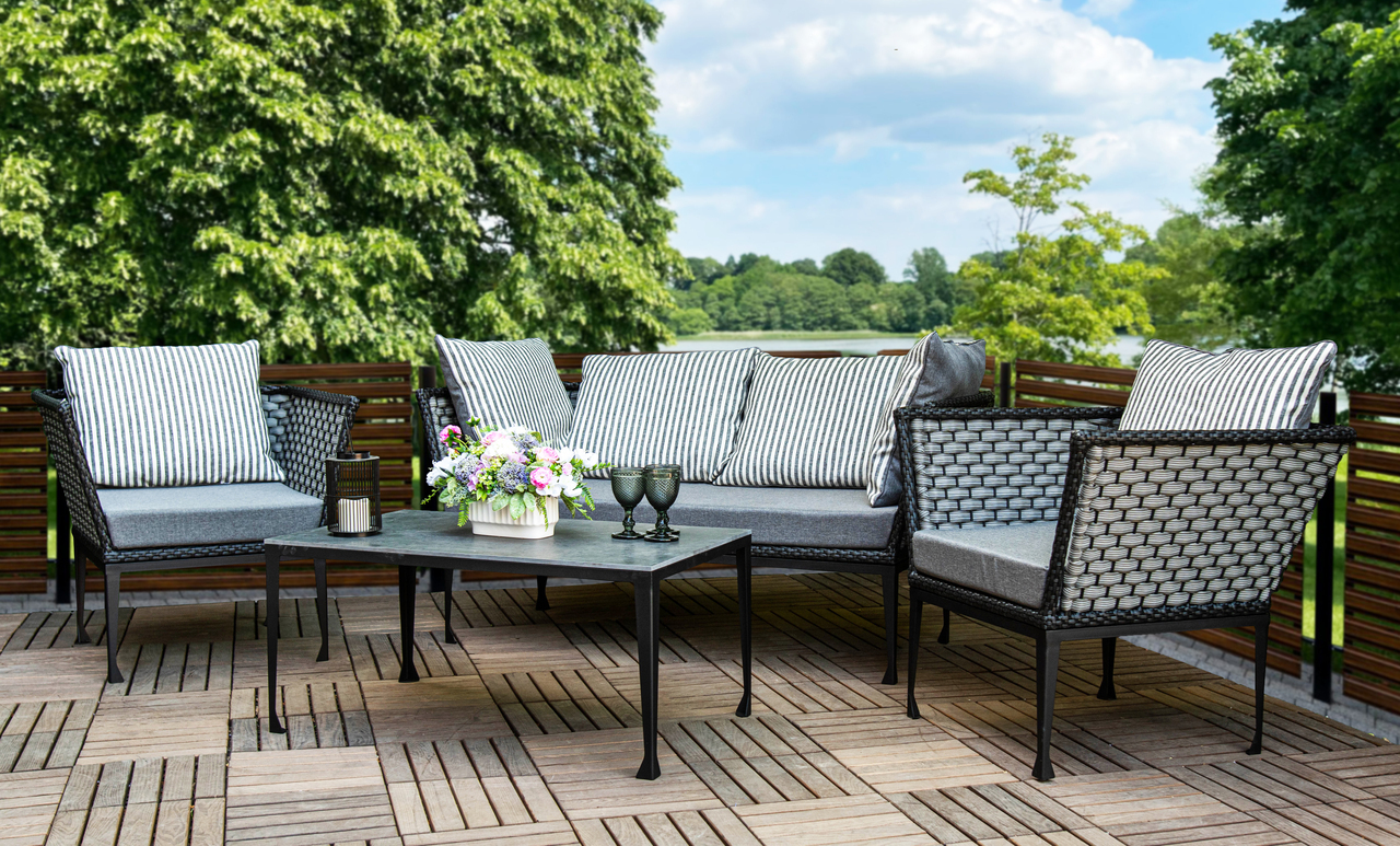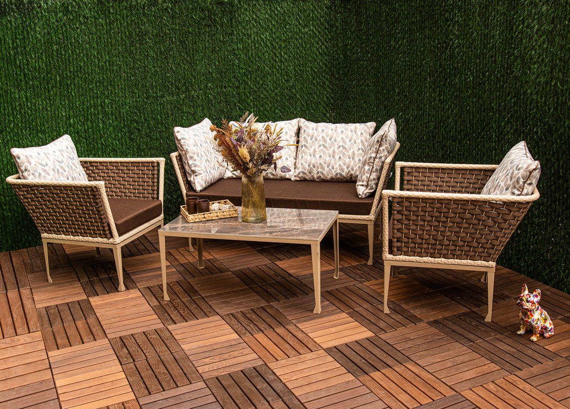 Садовая мебель «Оникс» состоит дивана, двух кресел и стола. Мебель изготовлена из металлического каркаса и дополнена мягкими, удобными подушками.
