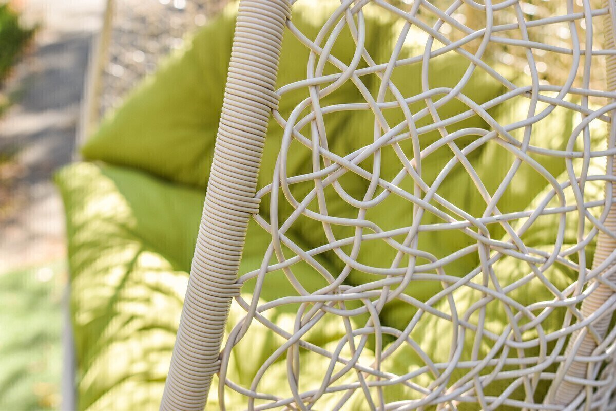 Материал, из которого изготавливается кресло, — искусственный ротанг. Его основная особенность — способен выдержать температуру от +55С до -30С. Этот материал не выгорает на солнце, не портится от влаги. Кресло может стоять на улице в любую погоду. Даже спустя 5 лет его внешний вид не изменится.