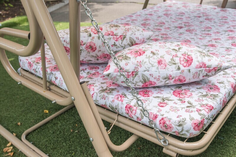 В стоимость качелей также включена цена подушки. Благодаря этому элементу создается дополнительный комфорт. Подушка сделана из экологически чистого наполнителя синтепух, снаружи обшита плотной тканью габардин. За отдельную цену можно выбрать другой вариант. Есть ткани класса люкс — мебельная рогожка и рогожка Этна. Они очень плотные и прочные, им не страшны даже домашние животные. Наполнитель же в варианте с тканями класса люкс не меняется.
